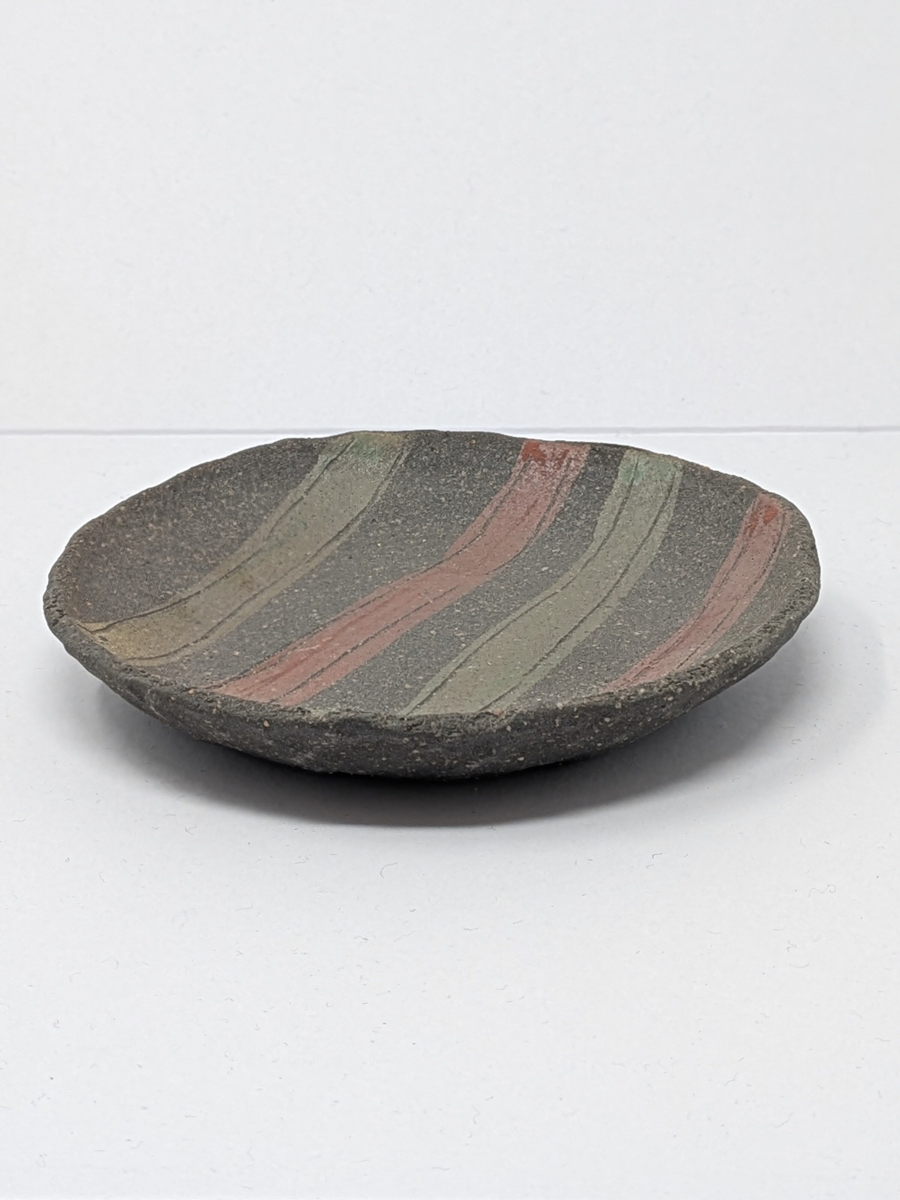竹内真吾が手掛けたこの炻器丸皿は、焼き締めの質感とタタラ成形の技術が見事に融合した美しい逸品です。象嵌されたデザインが印象的で、特別な食卓を彩る一皿となります。